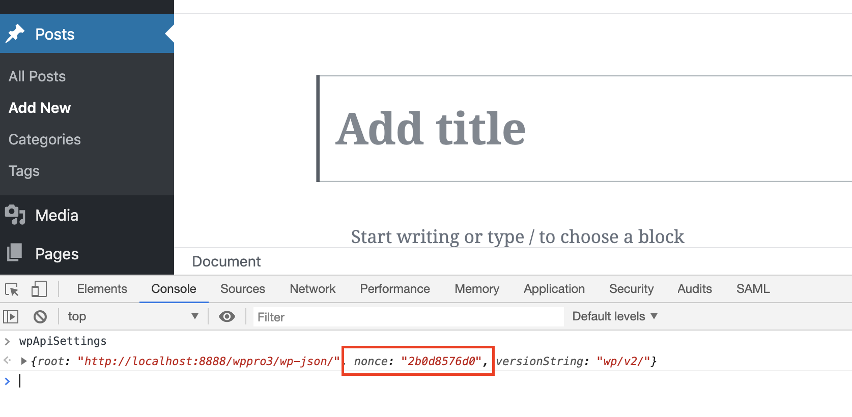 Open the browser console, so that we can copy the nonce. Type wpApiSettings in the developer console and we will get the nonce.